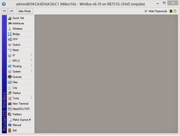 3. Klik connect dan akan masuk ke admin Mikrotik